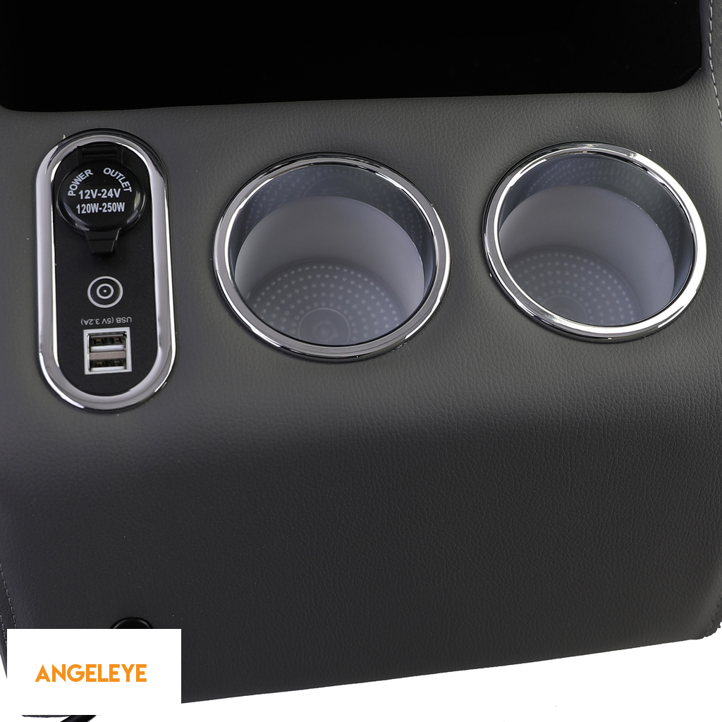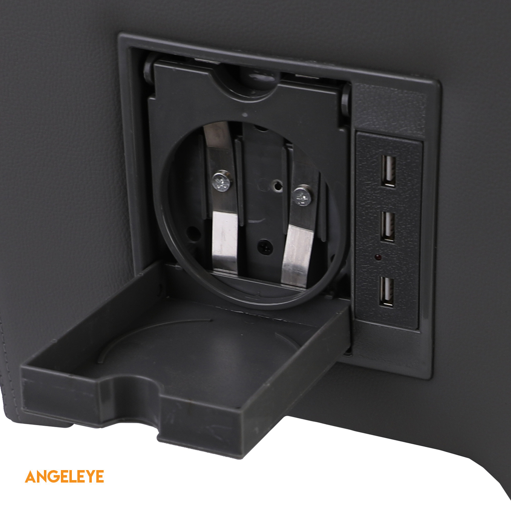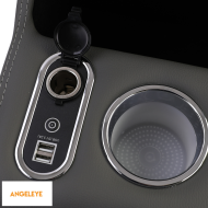 Cotiera glisantă dezvăluie un compartiment de depozitare mare dedesubt, oferind spațiu suplimentar. Cu un total de 5 porturi USB, 2 în față și 3 în spate, consola permite încărcarea simultană a mai multor dispozitive. De asemenea, sunt integrate două suporturi pentru pahare.