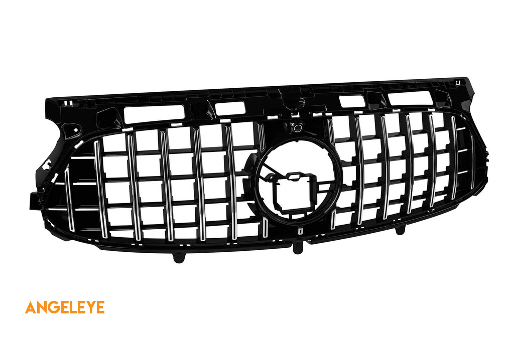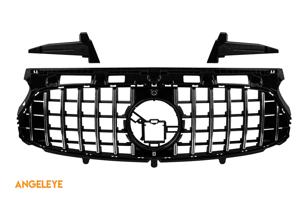 Grilă tip GT crom/neagră potrivită pentru Mercedes GLA H247 după 2020 pentru bara de protecție A Design cu deschidere pentru cameră