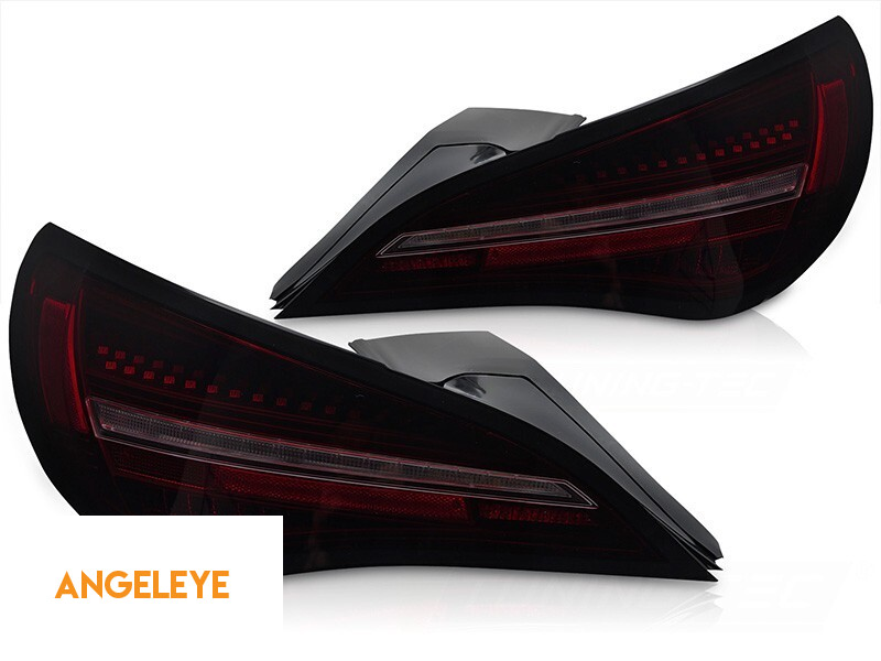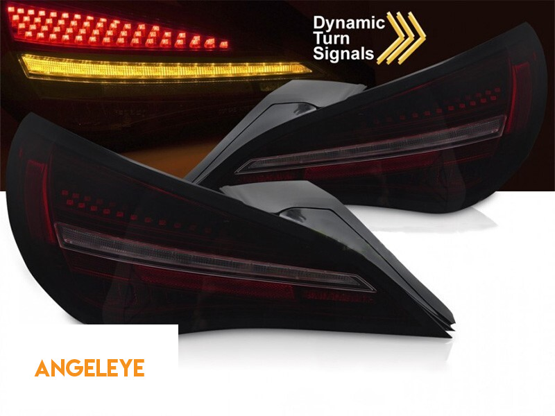 Kit de stopuri LED de tuning potrivit pentru Mercedes CLA C117 2013-2016 cu bază fumurie negru-roșie și semnalizator dinamic, pentru modelul echipat cu stopuri halogen, stânga și dreapta