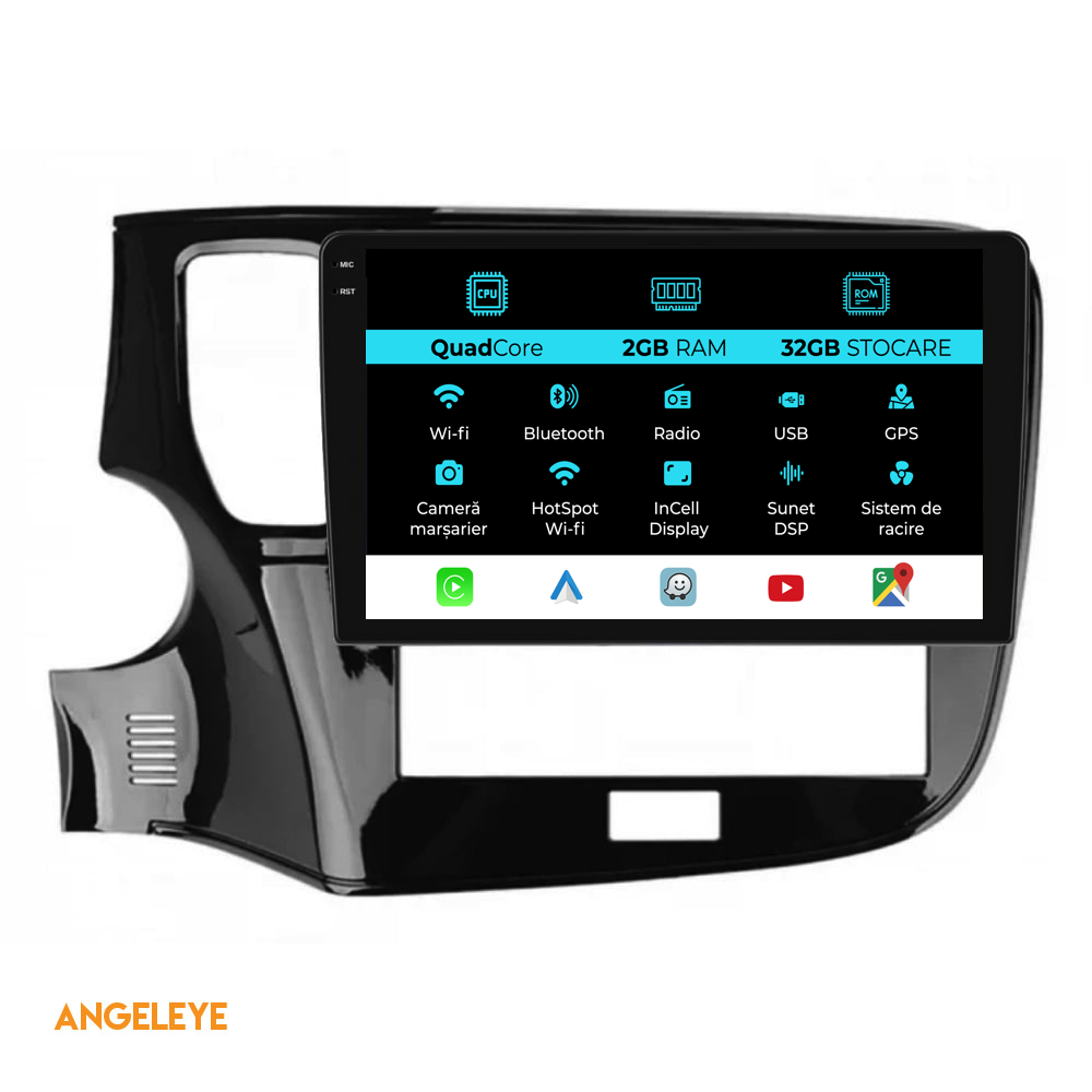 Sistem de operare: Android 13 Procesor: Quadcore Memorie RAM: 2GB Stocare interna (ROM): 32GB Dimensiune Display: 10 Inch Rezolutie ecran: 1280x800p Bluetooth: Bluetooth pentru apeluri, descarcare agenda telefonica si redare muzica WiFi: Da (Integrat) Slot Sim 4G: Nu Conectivitate retea: Hotspot telefon, router extern, dongle 3G sau 4G, CarPlay Android Auto Microfon: Microfon integrat, cu posibilitate de conectare microfon extern Alimentare: 12V Putere audio: 4x45W Egalizator DSP: Procesor de sunet digital (DSP EQ) Compatibilitate USB SD: Compatibil cu USB de pana la 128GB, suport SD prin adaptor USB Compatibilitate aplicatii Android: Compatibil cu majoritatea aplicatiilor Android din Google Play Compatibilitate CarPlay si Android Auto: Da, compatibil cu iOS (CarPlay) si Android (Android Auto) Suport pentru limbi:a Romana, Engleza, Maghiara, Spaniola, Italiana, Germana, etc. Tip ecran: TouchScreen capacitiv, multi-touch, IPS Setari luminozitate: Da Radio RDS: Da Iesire subwoofer RCA: Da Iesire video RCA: Da, cu ajutorul unui adaptor USB Iesire audio RCA: Da GPS: Da, (Google Maps, Waze, HereWeGo) Senzori de parcare: Da (Preluare senzori de parcare cu afisaj unde este cazul) Control volan: Da (Preluare comenzi volan cu canbus sau analogic unde este cazul) Compatibilitate camera DVR: Da Compatibilitate camera marsarier: Da Manual de utilizare: Da Continut pachet: Navigatie Android Rama adaptoare Cablaj de alimentare Antena GPS Conectori RCA Cablaj pentru camera de marsarier, 2 cabluri USB Canbus (doar daca este cazul) Certificat de garantie Factura fiscala Navigatia este compatibila cu urmatoarele marci auto : Mitsubishi: Outlander (2019-2021)