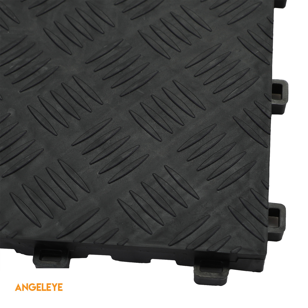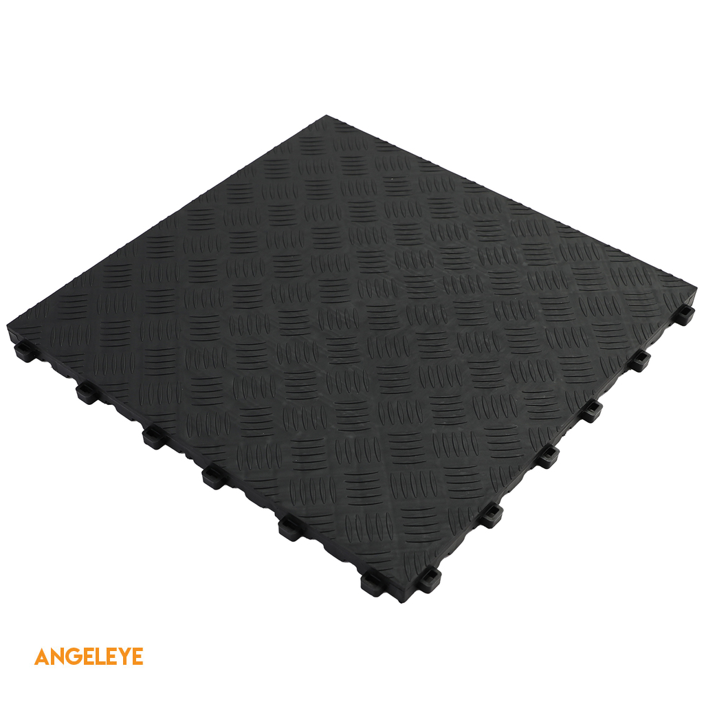Descoperiți soluția ideală pentru podeaua garajului, atelierului sau sălii de expoziție cu plăcile noastre de podea din plastic de înaltă calitate, cu un aspect de tablă cu carouri negre. Plăcile de podea din plastic RAMROXX măsoară 40x40 cm și au o grosime de 16 mm, subliniind robustetea și capacitatea lor de încărcare.
